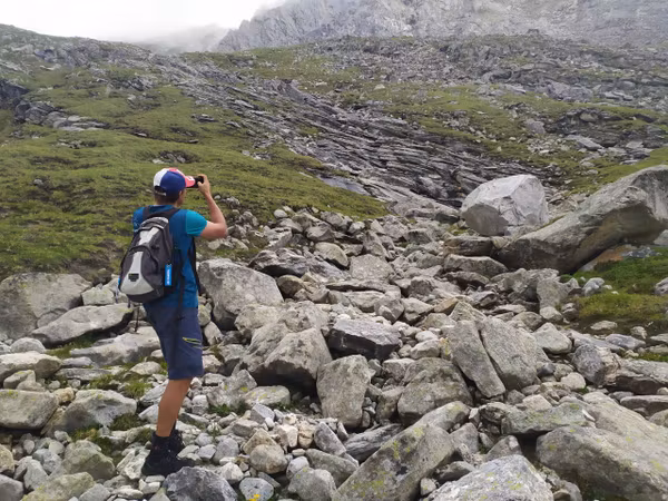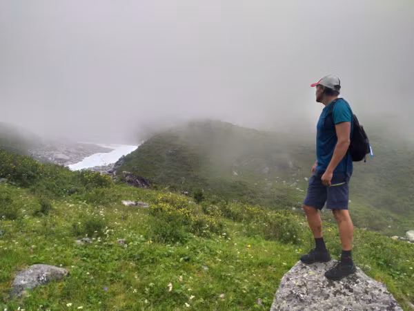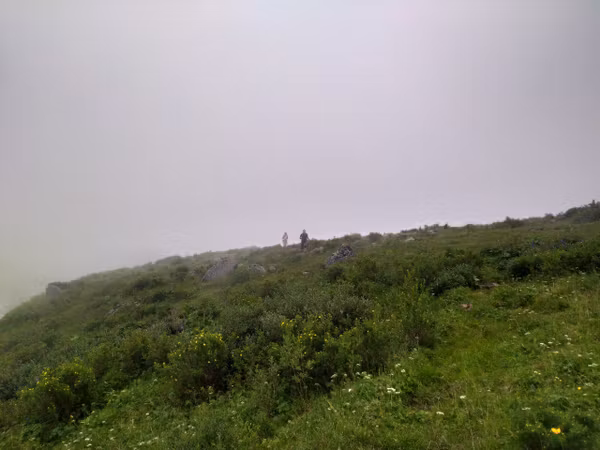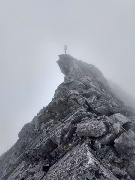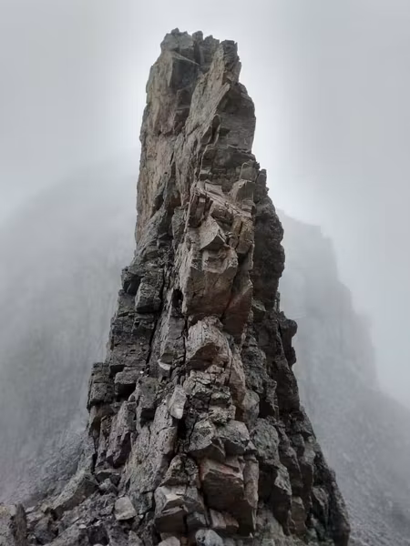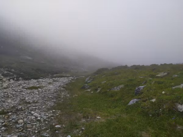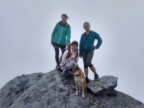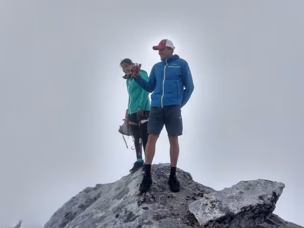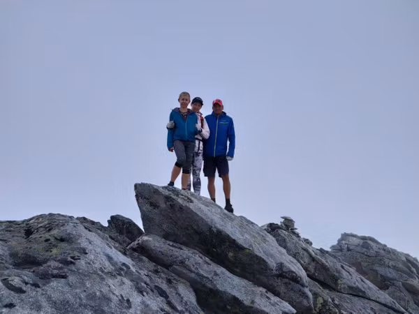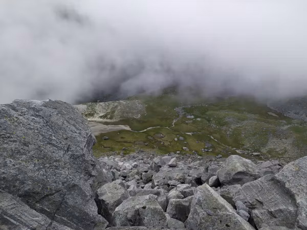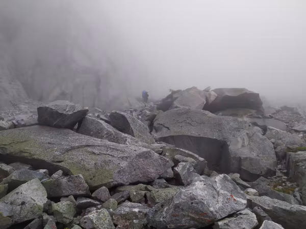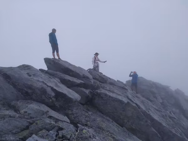 Надо отметить, что не все участники были рады пику: Аяна с нетерпением ждала, когда же мы наконец начнём спуск туда, где нет этих скользких камней. Кстати, к тому времени туман стал более осязаемым и промочил вовсю камни, сделав их непригодными для скоростного спуска.