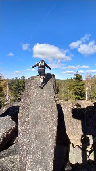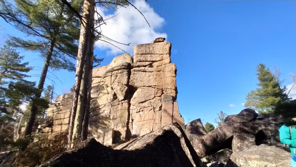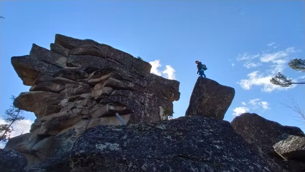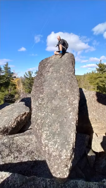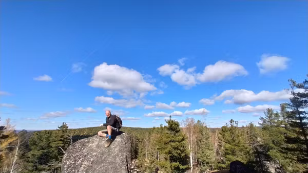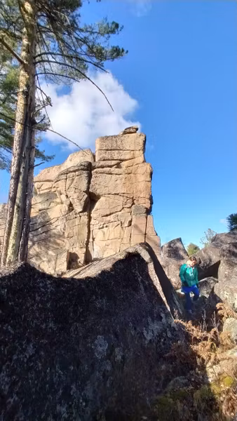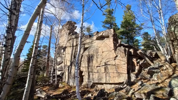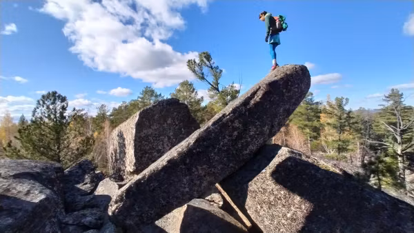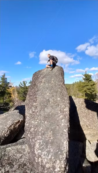 Вид этого скальника, появляющегося из лесу, впечатляет до ощущения невероятного! Неодинаков с разных сторон, есть где походить-попрыгать по «кубикам». Давно собиралась наведаться к этому чуду. Вот выдался прекрасный осенний денёк — звонкие стёклышки луж, монетки осиновых листочков, золотые свечки лиственниц, прохладно-леденцово-голубого цвета небо, тугой жгутик веселой речушки, друзья-единомышленники, и дорога, по которой можно ехать на велосипеде почти не спешиваясь.